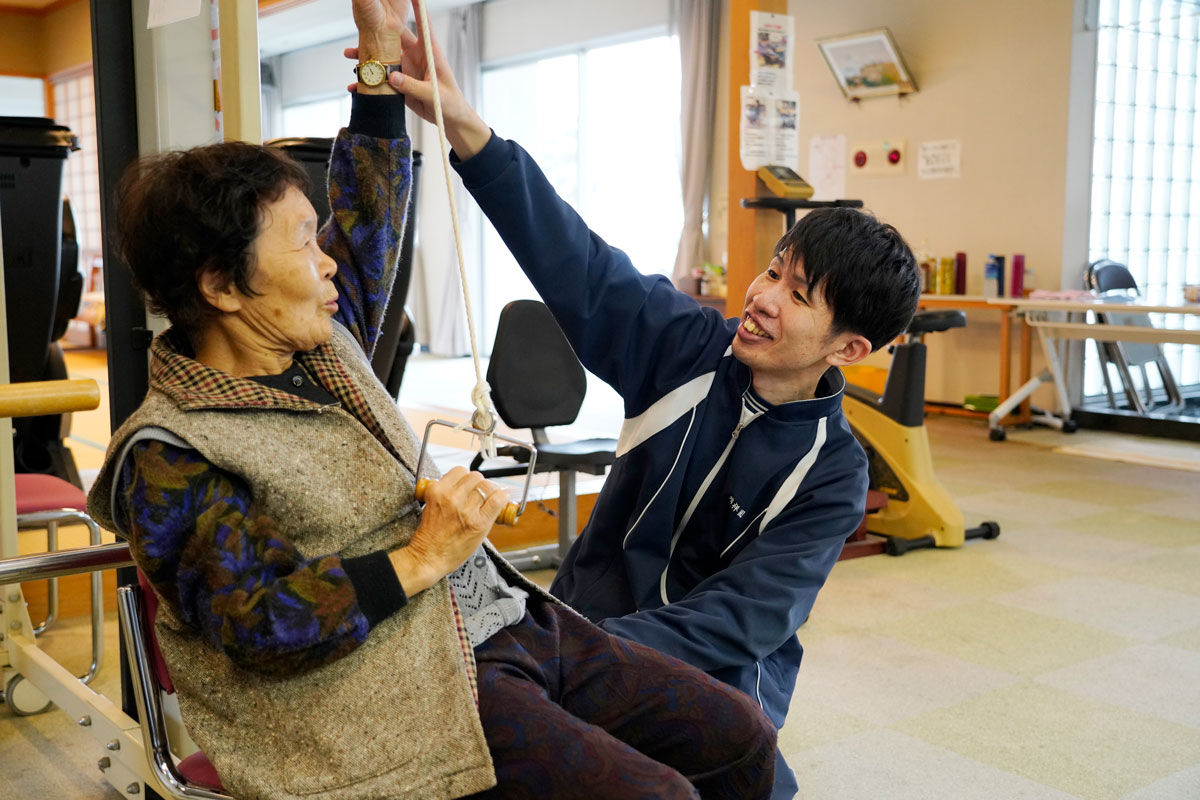 サービスを利用する方が、日常生活を営むうえで必要な機能の衰えを防ぐための訓練を指導するのが私の仕事です。ここでは理学療法士や作業療法士と意見を交わしながら、その人に合わせたプログラムを作成。整骨院での経験上、ケガをする要因・理由の知識があるので予防に特化した提案ができるし、痛みに対するアドバイスもできます。器具を使った運動の指導を行ったり、整体の施術で体のバランスを整えたり。柔道整復師だからこその強みを存分に発揮しているところ。ここに通って、立ち座りが自力でできるようになった利用者さんもいるんですよ。